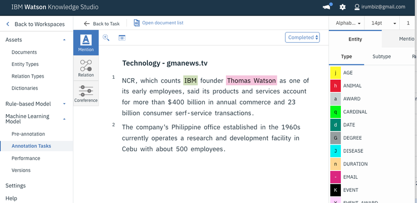 IBM Watson can analyze text in 10 different languages to extract intents, and interprets entities and dialogs from content. It is a highly scalable and versatile NLU platform but has a really steep learning curve. You can plug IBM Watson into chatbots, apps, bots, and IoT services. Watson performs its entity extraction via a predefined list of value you upload. You can enter synonyms for different entity values. You will likely spend a fair amount of time figuring out the platform and preparing assets for your domain from the ground up - entity/relation/dictionaries for training. Once you get past the initial set up, the UI is rather straightforward and actually quite pleasant to use. I think this level of heavy-lifting would only make sense for huge enterprises.