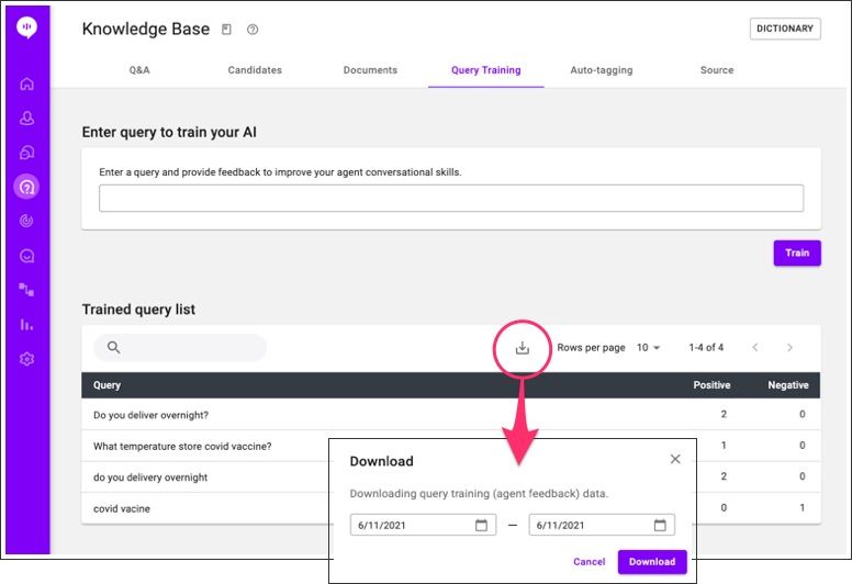 Keeping track of query training and feedback in your projects is essential in building a Knowledge Base that truly serves your company's needs. Rather than making assumptions, you can view the exact queries users submitted and whether or not AI learned based on the feedback.
