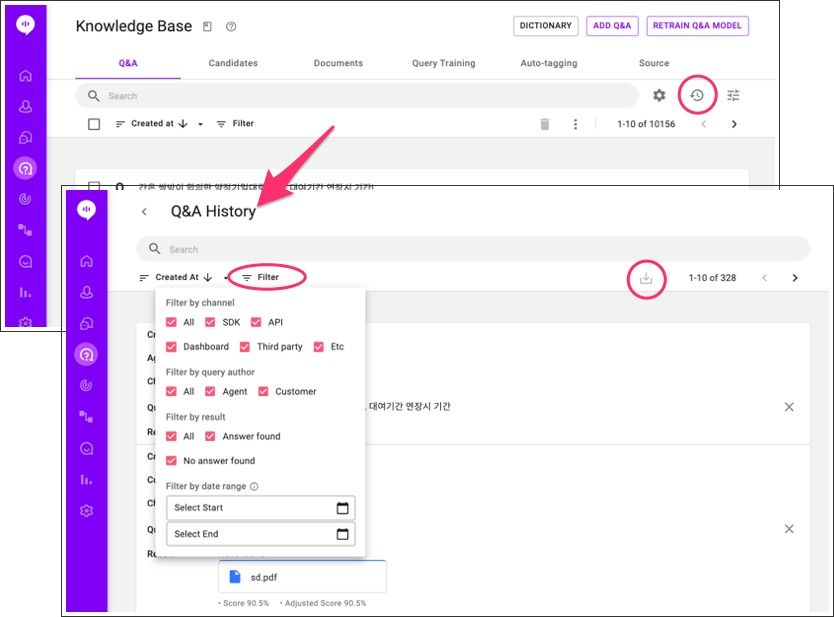 Keeping track of query training and feedback in your projects is essential in building a Knowledge Base that truly serves your company's needs. Rather than making assumptions, you can view the exact queries users submitted and whether or not AI learned based on the feedback. #매뉴얼